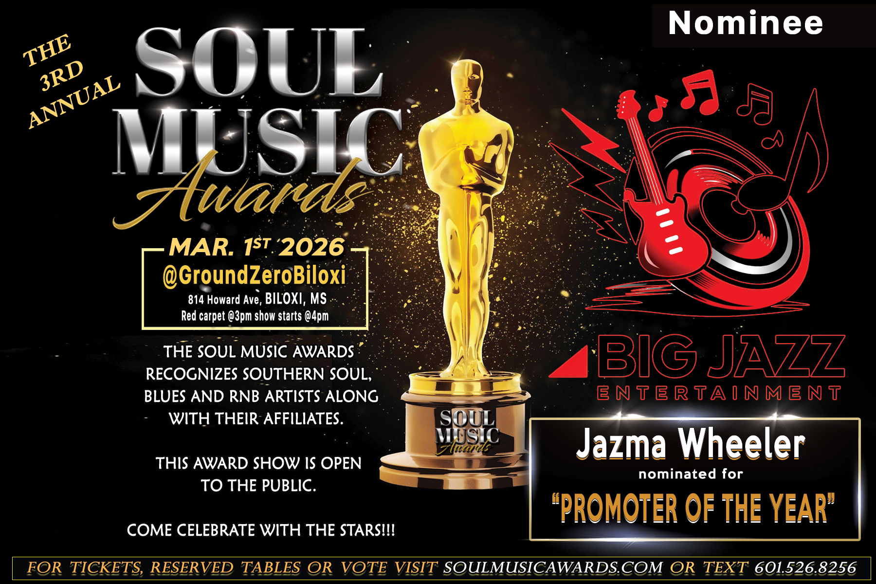 The 3rd Annual Soul Music Awards is set to honor and celebrate the significant contributions of outstanding artists to the music industry. Attendees can look forward to dynamic performances, special guest appearances, and opportunities to network with industry influencers and music aficionados. The event will feature special guests, including Southern Soul luminaries like Vick Allen, SeraBee, J'Cenae, Anissa Hampton, Omar Cunningham, Bre Wooten, Tay Cheesy and others